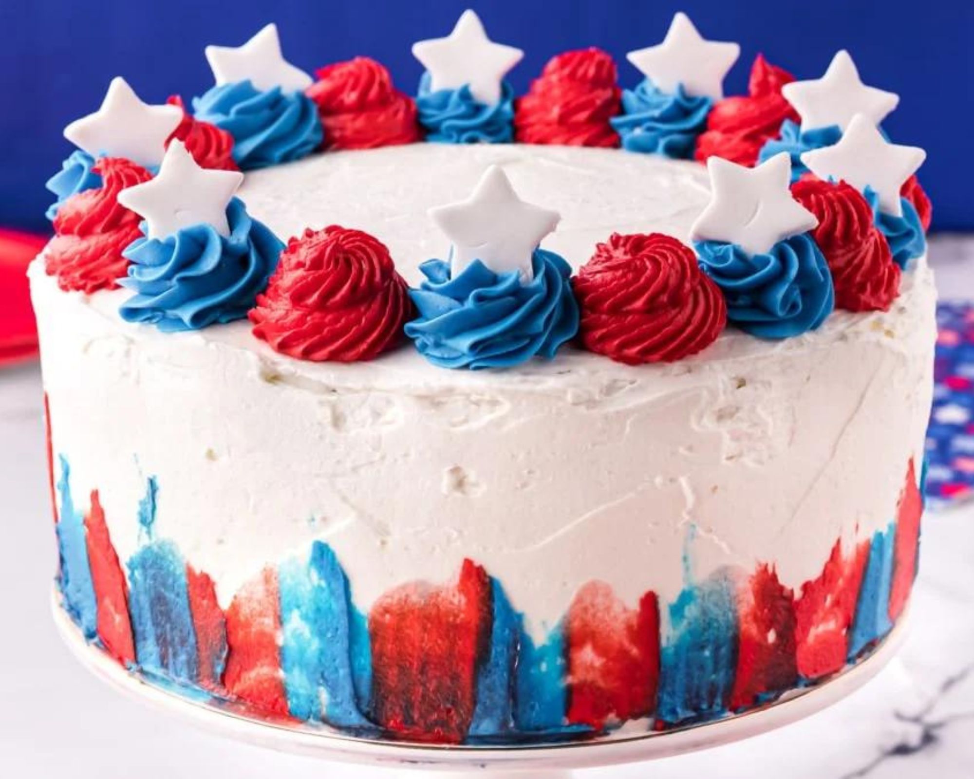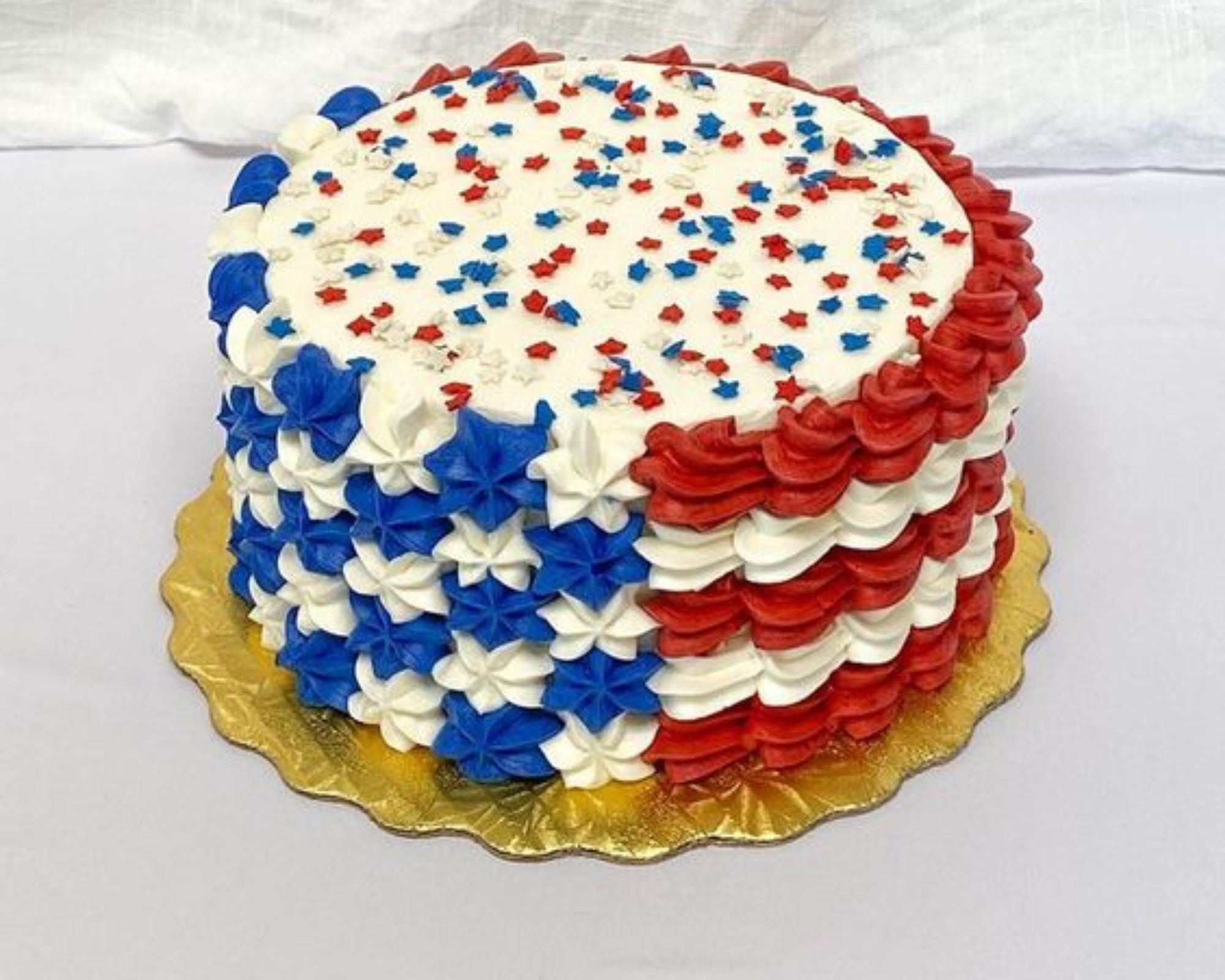 Está decorado utilizando crema de mantequilla para formar hermosas estrellas y rayas, ¡al igual que la bandera de Estados Unidos! Además, para darle ese toque especial, se han espolvoreado delicadas estrellas que combinan perfectamente con el diseño.