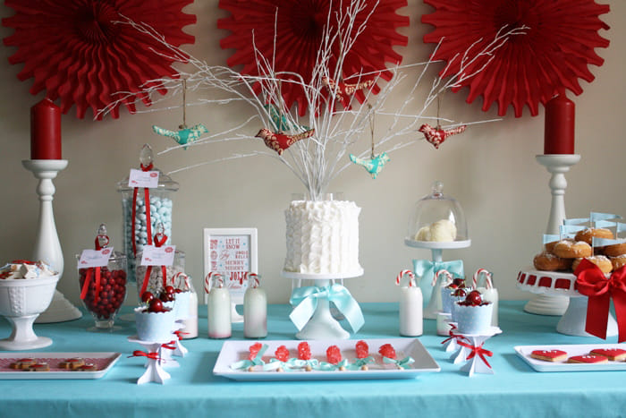 Desde Kara’s Party Ideas ésta bella mesa de postres llena de detalles navideños y un Santa Claus, Papá Noël en el centro sonriente ante los invitados a tan especial celebración.