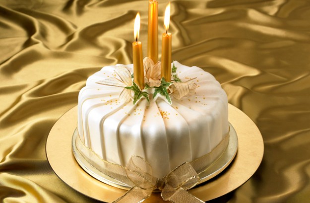 - Después cortamos las 3 velas con una ligera diferencia de altura entre ellas y las ponemos en las bolas de fondant que pusimos en medio del pastel. Espolvoreamos estrellas comestibles sobre la parte superior del pastel y ocultamos las bolas de fondant donde pusimos las velas con pequeños listones y con las hojas de hiedra artificiales. Y finalmente, atamos una cinta o listón de color oro alrededor de la base del pastel.